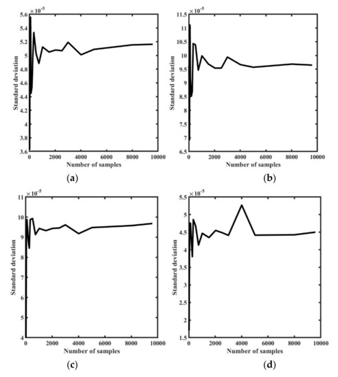 (a,b) represent the convergence of standard deviation with the increase in sample size at x = 15 mm and 45 mm for x strains, respectively, whereas (c,d) represent the y strains at x = 15 mm and 45 mm. Similarly, (e,f) represent the convergence plots for z strains at x = 15 mm and 45 mm respectively.
