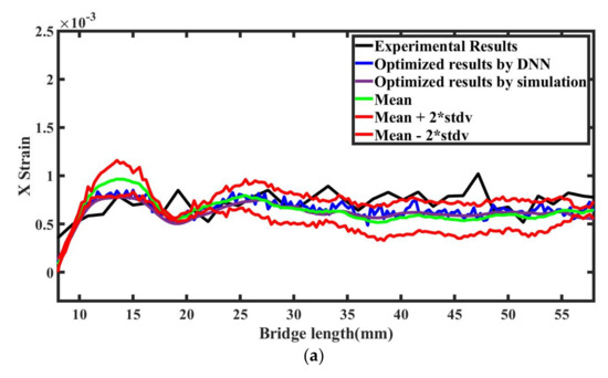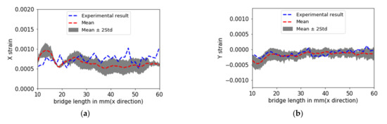 Confidence intervals of simulation results from DNN model and for the optimized parameters obtained from PSO. (a,b) represent the x and y strains, respectively.