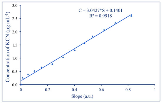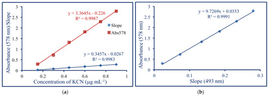 | Sample | KCN, * μg·mL−1 | Absorbance 493 nm | KCN, ** μg·mL−1 |