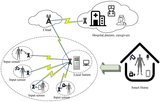 The rapid development of modern information and communication technologies, such as the Internet of Things, wireless communication, and cloud [1,2,3,4,5], makes remote healthcare, or tele-healthcare, simpler than before, as shown in Figure 1. In recent years, wireless sensor networks (WSNs) have matured to be used to improve quality of life, which is regarded as one of the key research fields in the healthcare application industry and has attracted more and more attention [6,7,8,9,10,11,12,13]. It is well known that, sensor nodes in WSNs generally adopt small embedded devices such as some wearable devices, and the battery power carried by a single node is limited. In the complex medical information environment, the application of WSNs is usually oriented to some large-scale monitoring fields, which is necessary to collect massive amounts of monitoring data. In order to realize the effective data acquisition of WSNs, it is very important to reduce the energy consumption of nodes. Multiple Phase Shift keying (MPSK) is provided in IEEE 802.15.4c standard [14,15]. Detection of coded MPSK signal has important research and application value by improving transmission efficiency, reducing the energy consumption of node transmission and improving the life cycle of healthcare network.