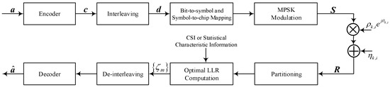Consider the transmission system depicted in Figure 2. The bit sequence is encoded to generate the coded sequence . After interleaving, every four bits from are finally mapped into a 16-bit chip sequence . Here, the modulation scheme is MPSK, and the Rayleigh fading channel is considered. Specifically, within N symbol intervals, the complex baseband received chip sequence can be given as follows: