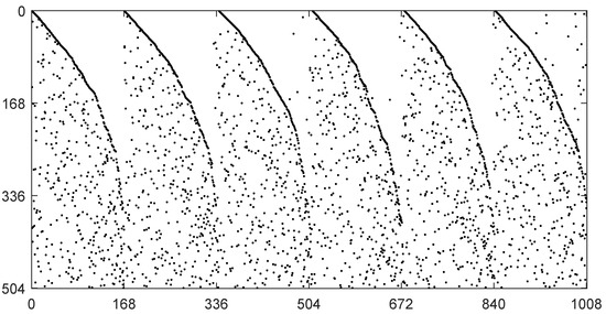 In this section, we analyze the performance of the proposed scheme from multiple dimensions by simulating the bit error rate (BER), symbol error rate (SER) and packet error rate (PER) performance, variance, and phase robustness of different schemes, as well as the complexity of the numerical calculation process. Note that in our simulation, the MPSK modulation is used, the (1008, 504) LDPC code shown in Figure 4 is considered, and the code rate is 0.5. The sum-product algorithm (SPA) or MS algorithm is considered for decoding [34], and the maximum number of iterations is set to 10. The detailed simulation parameters are shown in Table 2. For all the simulation results, we simulated enough symbols for each to collect at least 3000 symbol errors.