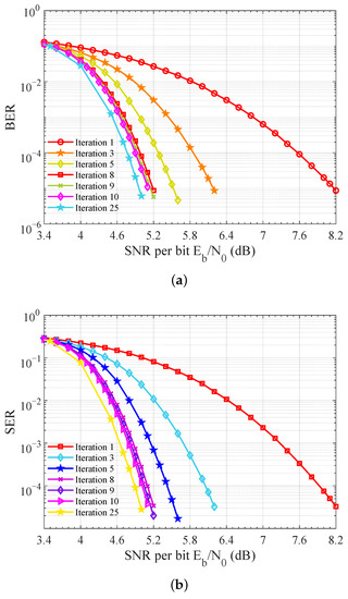 In a phase noncoherent channel with different iteration numbers, the BER, SER, and PER performance of the exact LLR in (8) are shown in Figure 5, where , . It can be seen from Figure 5 that when the maximum number of iterations is increased from 1 to 25, the BER, SER, and PER performance can be improved under fading channels. In particular, as shown in Figure 5a, when BER = , as the maximum number of iterations increases from one to three, the SNR gain is approximately 2 dB; when the maximum number of iterations is increased from three to five, the SNR gain is approximately 0.6 dB; when the maximum number of iterations is increased from five to eight, the SNR gain is approximately 0.3 dB; when the number of iterations is increased from eight to ten, the SNR gain is about 0.1 dB. Furthermore, after eight iterations, the performance can meet the requirement of the receiver. Additionally, the improvement is so small when the iteration ranges from 10 to 25 that we set the maximum number of iterations to be 10.