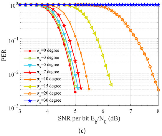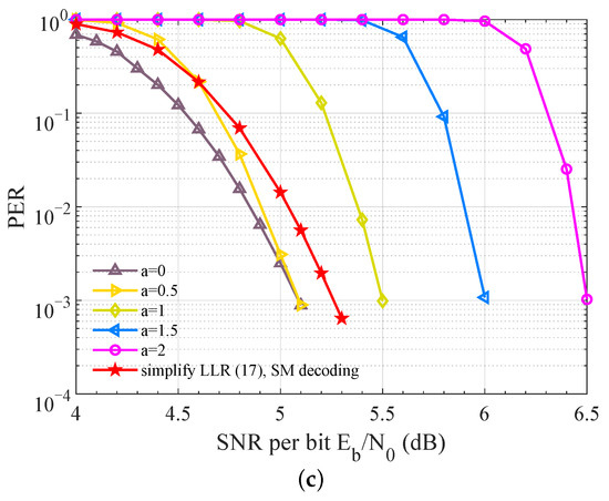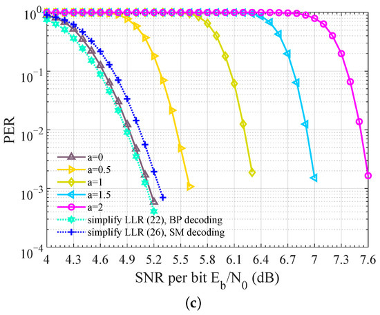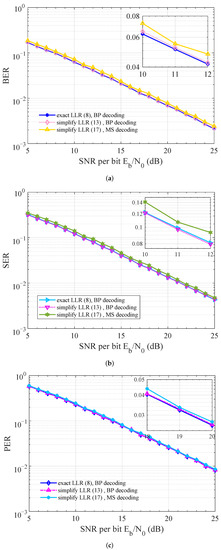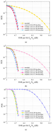 Under phase noncoherent channel, the BER, PER, and SER performance of the proposed simplified scheme, uncoded scheme, and the exact LLR scheme are verified, where , . As can be seen from Figure 6, compared with the uncoded scheme, the detection performance of the coding scheme is significantly improved. In addition, the performance of the simplified LLR scheme is extremely close to that of the exact LLR scheme. As shown in Figure 6c, when PER = , compared with the uncoded scheme, the proposed simplified scheme obtains a gain of nearly 5.7 dB. Further, compared with the exact LLR scheme, the simplified LLR scheme in (13) only has a performance loss of about 0.04 dB, and the simplified LLR schemes in (16) and (17) has a performance loss of about 0.16 dB. Therefore, the simplified scheme has little performance loss and friendly-complexity. In particular, the simplified LLR scheme in (16) do not require CSI when using MS decoding. In addition, as shown in Figure 7, we can draw similar conclusions under , which however is not illustrated here. In a word, our simulation results in Figure 6 and Figure 7 indicate that our simplified LLR scheme depicts good performance under the phase noncoherent channel. Note that no CSI and process for zero-order Bessel function of the first kind is needed in our simplified scheme.