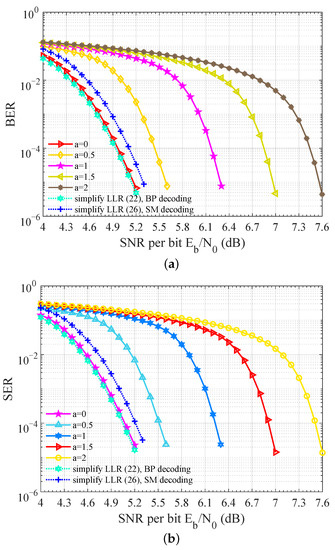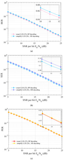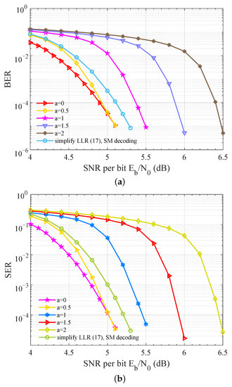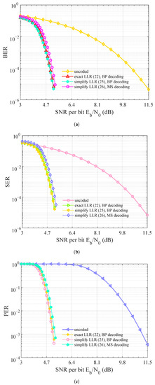 In the Rayleigh fading channel, the BER, PER, and SER performance of the proposed simplified scheme, uncoded scheme, and the exact LLR scheme are verified. As can be seen from Figure 8, compared with the uncoded scheme, the detection performance of the coding scheme is significantly improved. The performance of the simplified LLR scheme is extremely close to that of the exact LLR scheme. As shown in Figure 8c, when PER = , compared with the uncoded scheme, the proposed simplified scheme obtains a gain of nearly 6.1 dB. Compared with the exact LLR scheme, the simplified LLR scheme in (25) only has a performance loss of about 0.02 dB, and the simplified LLR scheme in (26) has a performance loss of about 0.1 dB. Therefore, the simplified scheme has little performance loss and friendly-complexity. In particular, the simplified LLR schemes in (26) do not require CSI when using MS decoding. In addition, as shown in Figure 9, we can draw similar conclusions under , which, however, is not illustrated here. Clearly, our simulation results in Figure 8 and Figure 9 indicate that our simplified LLR scheme depicts good performance under the Rayleigh fading channel.