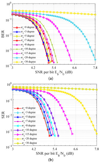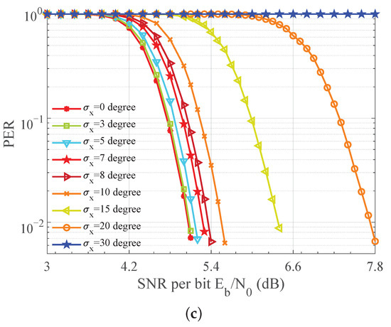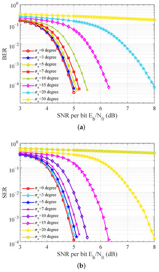 In this part, we study the detection performance of the LLR schemes given in (8) and (16) in fading channel with changing carrier phase, where . The phase is modeled as a Wiener process, wherein its initial value is uniformly chosen from . As shown in Figure 12 and Figure 13, the performance of the proposed receiver does not significantly degrade if we increase the standard deviation of jitter from 0 degrees to 7 degrees. In addition, an irreducible error floor is observed for the LLR given in (8) and (16) with the increase in SNR. As shown in Figure 13, our proposed LLR scheme in (16) is clearly robust to dynamic phase jitter.