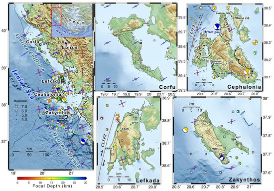 Three major tectonic features in the Ionian Islands define the regional kinematic field and control the seismic activity: the convergence of the Apulian Platform and the Hellenic foreland in the north; the long NNE–SSW Cephalonia–Lefkada Transform Fault Zone offshore and west of the respective islands in the central part; and the northwestern tip of the Hellenic Arc in the southern Ionian Sea. These major structures, together with smaller local faults, create a complex tectonic environment generating intense seismic activity and strong ground deformation. In the present study, seismological and geodetic data from the area of the Ionian Islands were combined for the periods before, during and after the occurrence of strong earthquakes in 2014–2018. In the following, the results of the joint analysis are discussed in terms of the overall tectonic status of the study area.