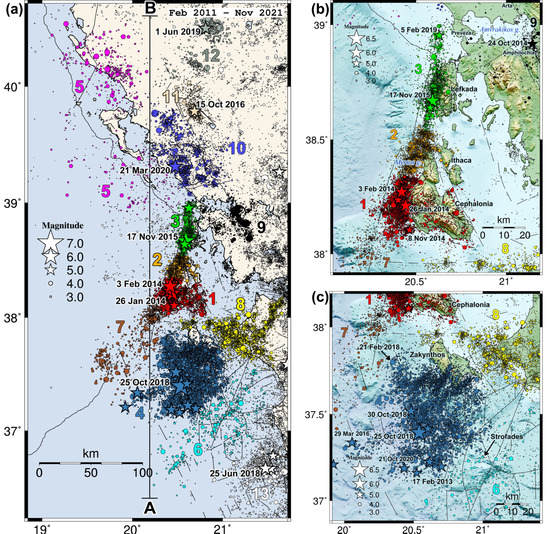 (a) Seismicity in the region of the Ionian Islands during the period February 2011–November 2021 from the databases of GI-NOA and SL-NKUA, including relocated catalogues for the three main aftershock sequences [29,32,64,65]. Colors and numbers correspond to different spatial groups. The north–south-oriented profile A–B is used for the spatiotemporal projection of Figure 3b. (b) Close-up of the seismicity in the region of Cephalonia–Ithaca–Lefkada Islands. (c) Close-up of the seismicity in the region of Zakynthos Island.