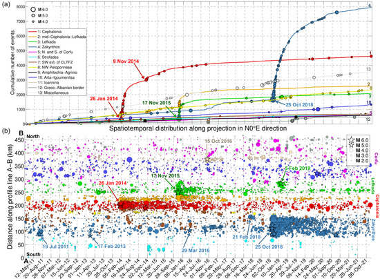 After visual inspection, the seismicity of the study area during the last decade was divided into 12 spatial groups (Figure 2), to enable the description of its spatiotemporal evolution. Seismicity marginal to the area of interest was placed in the miscellaneous group #13 (white). The magnitude of completeness is estimated at Mc = 2.0 ± 0.2, with variations depending on the method used for its determination or the time period of a selected subset. At times, it reaches lower values, e.g., 1.5, whereas during the occurrence of significant earthquakes that produce series of large aftershocks, the magnitude of completeness may temporarily surpass 2.5. The cumulative number of events per spatial group (Figure 3a) and the spatiotemporal projection (Figure 3b) along the A–B profile of Figure 2a are drawn after the application of the magnitude threshold (M ≥ Mc = 2.0). The herein referred magnitudes are ML, unless otherwise stated.