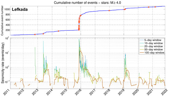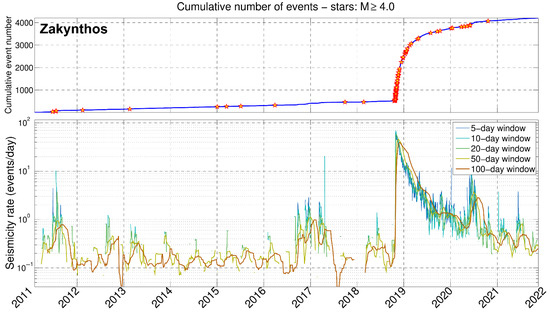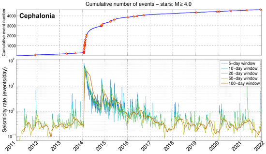 Temporal evolution of the seismic sequence on Cephalonia Island (group #1), for events with M ≥ Mc = 2.0. The upper panel shows the cumulative number of events, with the occurrence of M ≥ 4.0 events depicted by stars, while the lower panel describes the seismicity rate on a semi-logarithmic scale, measured for sliding windows of various lengths (5 days to 100 days).