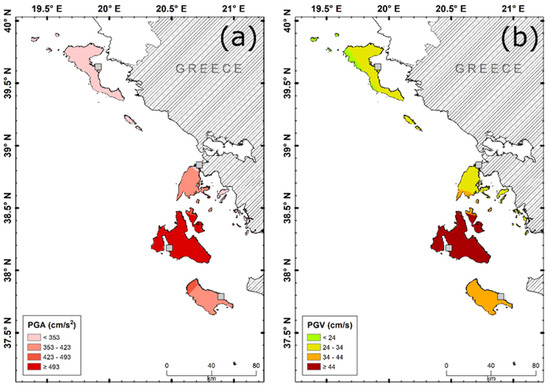 The Greek Building Code [62] classifies the Ionian islands into two zones: Zone II (with PGA of 235 cm/s2) and Zone III (with a value of 353 cm/s2). Lefkada, Cephalonia, Ithaca and Zakynthos Islands are in Zone III, with Corfu and Paxoi classified in Zone II. While the code provides wide ranges, the current analysis indicates that there may be a need for a more detailed approach. The expected PGA at Corfu and Paxoi was found to be the lowest in the Ionian Islands, being less than 353 cm/s2. However, it was observed that for Zone III islands, a much finer distribution could be extracted (Figure 7a). Moreover, Cephalonia and Ithaca seemed to feature PGA values much higher than that of the Seismic Code. Making this distinction by introducing a new Zone with stricter building guidelines could prove to be a useful approach to reduce seismic vulnerability—and therefore, risk—in a financially significant area of the Ionian prefecture. Revising the national code would also offer the opportunity to rethink local actions for improving the seismic resilience of older and historical buildings in cities and towns (e.g., Argostoli in Cephalonia) that teem with them. Other seismic hazard studies, albeit Greece-wide, also find PGA values that well exceed those proposed by the building code [80,84].