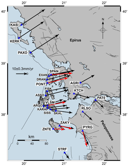 Horizontal velocity vectors (black arrows) for the continuous GNSS sites (blue triangles) of the broad Ionian Islands area. Red arrows indicate the horizontal velocity component estimated for the period after the strong (M > 6) earthquakes in the area (ITRF 2014).