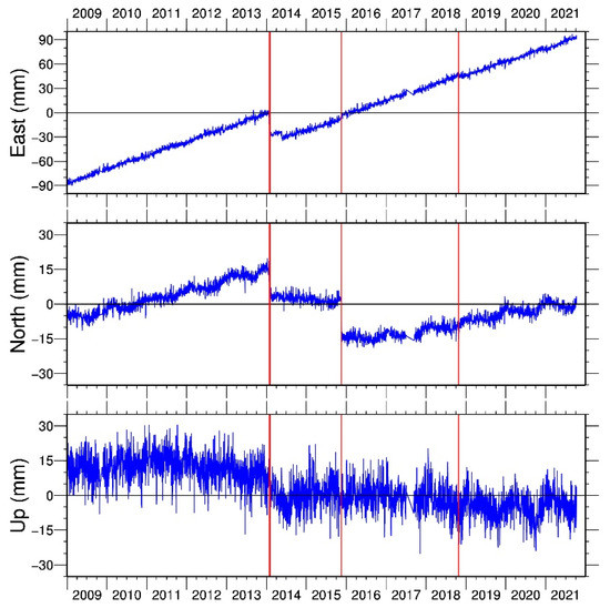 Time Series of VLSM Cephalonia GNSS station. Red lines mark the dates of the strong earthquakes in the Ionian Islands.
