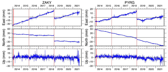 Time series for the two GNSS stations in Zakynthos (ZAKY) and the western Peloponnese (PYRG). Red lines are the same as Figure 9.