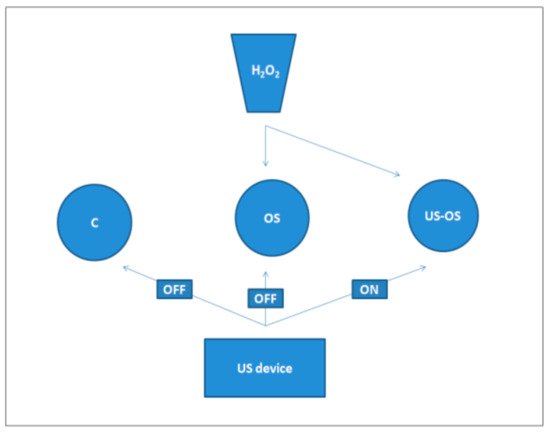 Experimental set-up chart. (H2O2—hydrogen peroxide exposure, C—control group, OS—oxidative stress group, US-OS—ultrasounds—oxidative stress group, US device—ultrasound generator device).