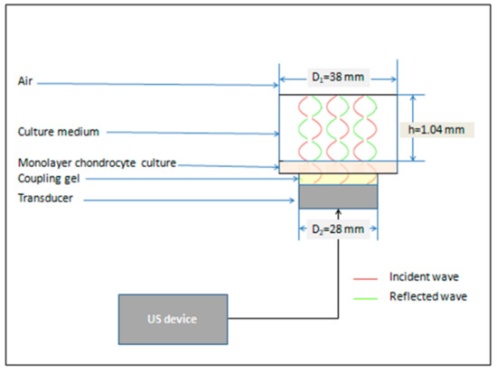 Ultrasound exposure. (D1—Petri dish diameter, D2—transducer diameter, h—chondrocyte growth medium height, US device—ultrasound generator device).