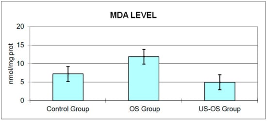 MDA level in control group, OS group, and US-OS group. MDA level increased in OS group compared to control group (p < 0.05). In the US-OS group the MDA level decreased compared to the OS group (p < 0.05). (MDA—malonildialdehyde, OS group—oxidative stress group, US-OS group—ultrasounds- oxidative stress group, CG—control group).