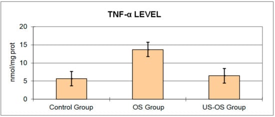 TNF-α level in control group, OS group, and US-OS group. TNF-α level increased in OS group compared to control group (p < 0.05). In US-OS group TNF-α level decreased compared to OS group (p < 0.05). (TNF-α—tumour necrosis factor–α, OS group—oxidative stress group, US-OS group—ultrasounds- oxidative stress group, CG—control group).