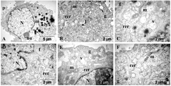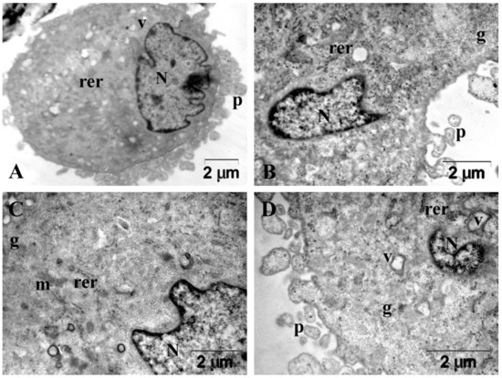 Chondrocytes aggregates were processed for transmission electron microscopy (TEM) according to the usual protocols (Hayat, 2000; Watt, 2003) [47,48]. The chondrocyte aggregates were prefixed with 2.7% glutaraldehyde (Electron Microscopy Sciences, Hatfield, PA, USA) in 0.1 M PBS for 2 h, washed four times with 0.1 M PBS, postfixed with 1% osmium tetroxide (Fluka, Buchs, Switzerland) in 0.15 M PBS for 1.5 h, and washed with 0.15 M PBS. Next, they were dehydrated in an acetone series (30–100%) and embedded in Epon 812 (Fluka). Ultrathin sections obtained using glass knives on a Bromma 8800 ULTRATOME III (LKB, Bromma, Sweden) were contrasted with alcoholic uranyl acetate (Merck, Darmstadt, Germany) and lead citrate (Fluka). The sections were examined on a JEOL JEM 1010 transmission electron microscope (JEOL Ltd., Tokyo, Japan), and images were captured using a Mega VIEW III camera (Olympus, Soft Imaging System, Munster, Germany).