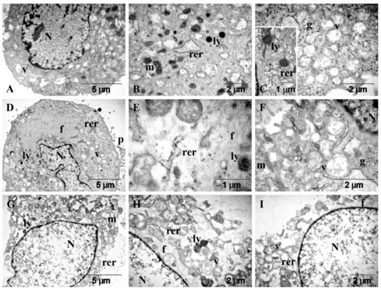 Oxidative stress (OS) group: (1) chondrocytes with cvasinormal aspect (A–F): many electron-transparent vacuoles (v), lysosomes (ly), large amount of expanded rough endoplasmic reticulum (rer), more condensed matrix of mitochondria (m), excessive amount of fibrillar material more compact and electron-dense (f); (2) chondrocytes with signs characteristic for necrosis (G–I): many vacuoles (v) and disorganized organelles in cytoplasm, ballonized nuclei (N) with lysated chromatin.