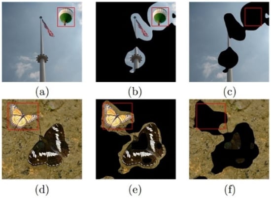 The results of the CCW chroma detection. (a,d) Tampered images; (b,e) the images after superpixel segmentation; (c,f) chroma detection results. The red box area denotes the tampered area hereinafter.