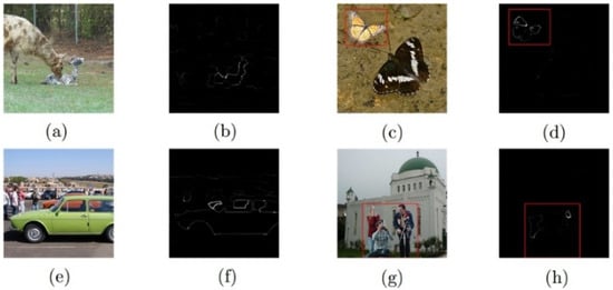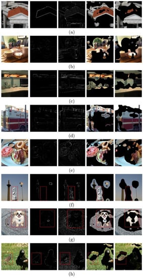 As shown in Figure 8a–d, when there are focusing and defocusing regions in the untampered image due to the range of the depth of the field, the sharpness detection operator can detect the focusing region, as shown in Figure 8b. For tampered images, when there are multiple focusing regions at different depths of field positions, the results given by the sharpness detection operator will show two clear regions separated by a certain distance, as shown in Figure 8d. It can also be seen from Figure 8e–h that when there is no obvious change in the depth of field in the untampered image and the overall image has high sharpness, or when there are multiple objects on the focal plane, the results given by the sharpness detection operator will be scattered into multiple clear regions, as shown in Figure 8f. At the same time, for different depths of the field, when the background is blurred, a foreground with extreme sharpness will also lead to detection errors. For tampered images, when one or more of the following conditions exist, the results given by the sharpness detection operator will be confused with the detection results of untampered images, namely, the focusing region of the untampered image is not obvious, or the introduced tamper region is not the focusing region of another image, or the tampered area overlaps with the focusing area of the pre-tampered image.
