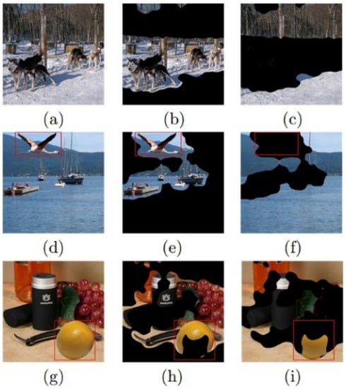 As the results obtained by NSS in Section 2.3 are statistical features and cannot be displayed intuitively, only the results of the CCW salient region detection operator are shown in Figure 9. Figure 9a–f illustrate the fact that the saliency detection operator can divide the image into ROI and RONI, and the tampered region exists in one of the two regions due to its relatively consistent brightness and structural complexity, thus facilitating subsequent NSS feature extraction. From Figure 9g–i, it can also be seen that there may be brightness changes or structure complexity changes within the tampered area, or there may be multiple tampered areas. As a result, the brightness and structure complexity of some areas in the tampered region are similar to those in the untampered area. At this time, the tampered region will appear in both ROI and RONI, thus eventually leading to incorrect classification results.