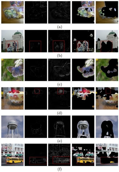 where the threshold T is set as the mean value of the saliency map, i.e., ; and is the template image after binarization of the saliency map, which can be employed to extract the ROI of the image. Figure 3 shows the results of some examples of the segmentation implemented according to (11).