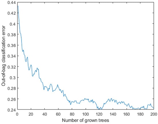 Uusing the random forest classifier and K-fold cross-validation method, the three features can be classified. The number of feature variables selected at random for each decision split is equal to the square root of the total number of variables for classification. The maximum depth of the tree is not limited, and then the nodes are expanded until all leaves are pure or until all leaves contain less than the minimum number of samples required to split an internal node, which is set to 2. The minimum number of observations per tree leaf is 1. The number of decision trees in the random forest affects the classification performance of the algorithm. Figure 11 shows the out-of-bag error over the number of grown classification trees.