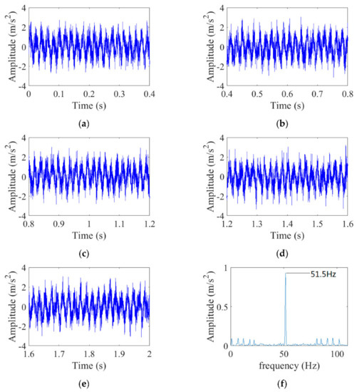 Simulated signal. (a) The waveform of simulated signal between 0 and 0.4 s; (b) The waveform of simulated signal between 0.4 and 0.8 s; (c) The waveform of simulated signal between 0.8 and 1.2 s; (d) The waveform of simulated signal between 1.2 and 1.6 s; (e) The waveform of simulated signal between 1.6 and 2 s; (f) Fourier spectrum of simulated signal.