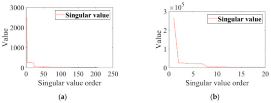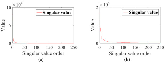 Singular value decomposition (SVD) is very useful in signal denoising [19,20,21,22]. Many studies are interested in the way to select a threshold r, and denoise the signal by retaining the singular components (SCs) with the first r largest singular values. Zhao et al. utilized periodic modulation intensity to quantify the diagnostic information in a signal. With this intensity, the decomposed SCs can be sorted according to their information levels [23]. Guo et al. [24] proposed a method to select the order of singular value decomposition according to the saturation order of the singular entropy. Zhao et al. [25,26] have proved that there is a twofold relationship between the number of non-zero singular values and that of frequencies in sinusoidal signals, and this conclusion is proved theoretically by Guo et al. [27], who also pointed out that SVD has amplitude filtering characteristics.