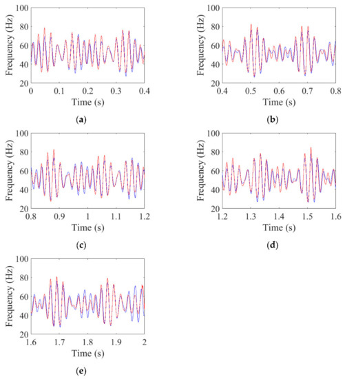 The waveform of the IF for simulated signal (red: ideal; blue: purified). (a) The waveform of the IF between 0 and 0.4 s; (b) The waveform of the IF between 0.4 and 0.8 s; (c) The waveform of the IF between 0.8 and 1.2 s; (d) The waveform of the IF between 1.2 and 1.6 s; (e) The waveform of the IF between 1.6 and 2 s.