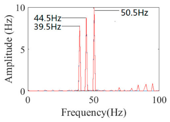 The purified IF and ideal IF are revealed in Figure 3 and Fourier spectrum of purified IF and ideal IF are revealed in Figure 4, where the red line is the ideal IF and the blue line is the purified IF. It is illustrated that the extracted IF agrees well with the ideal IF. The absolute error of oscillating amplitude of purified IF is shown in Table 1; the maximum absolute error is 0.41 Hz.