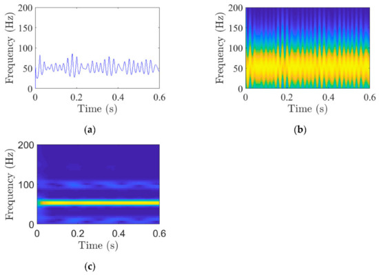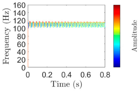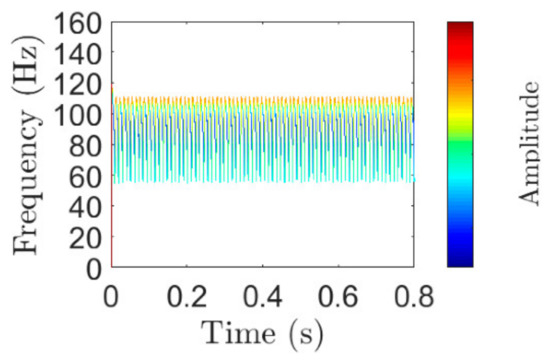 The sampling frequency is 5120 Hz, the sampling point is 10,240. The waveform of ideal IF of is shown in Figure 5. To enlarge the waveform for easy viewing, only the results from 0 s to 0.6 s are displayed here. The results obtained by STFT, and Hilbert transform are shown in Figure 6. By comparing Figure 5 and Figure 6a, it is found that their waveforms are the same, except that the value at the left end of Figure 6a is slightly smaller than the ideal value. The short-time Fourier transform (STFT) is used for , when the length of the window is 128. Additionally, the result of STFT is shown in Figure 6b. By comparing Figure 5 and Figure 6b, it is found that the instantaneous frequency fluctuation range of the STFT results is larger than that of the ideal instantaneous frequency. Additionally, Figure 6b has a lower frequency resolution. To make the frequency resolution of STFT higher, the length of the window was adjusted to 1280. By comparing Figure 5 and Figure 6c, it can be found that Figure 6c cannot show the characteristic of rapid change of instantaneous frequency. Additionally, the time–frequency diagram obtained by using STFT cannot guarantee good frequency resolution and the fast-changing instantaneous frequency can be displayed at the same time, no matter how we adjust the length of the window. In fact, the time–frequency diagram obtained by using STFT cannot guarantee good time resolution and good frequency resolution at the same time [29].