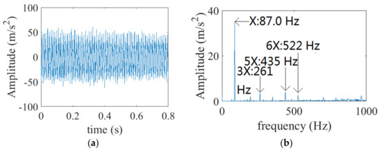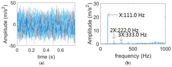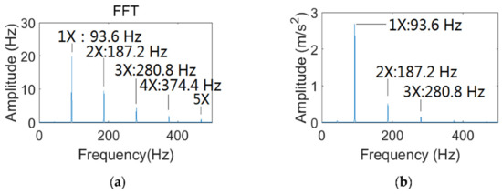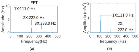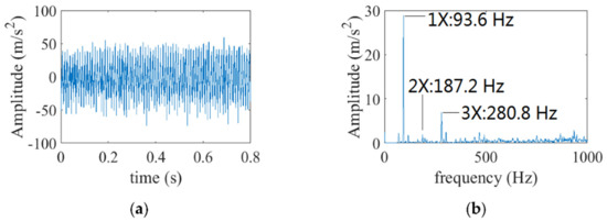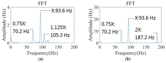 The waveform and FFT of is revealed in Figure 8, and is set to 5616 r/min. It is illustrated that the amplitudes of 1× and 2× are relatively high, and the amplitude of 3× is lower, as revealed in Figure 8b.