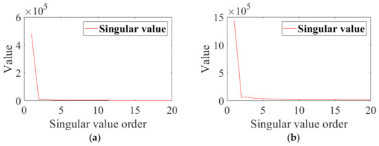 The singular values of SVD. (a) Singular values of SVD of u1(t); (b) Singular values of SVD of u4(t).
