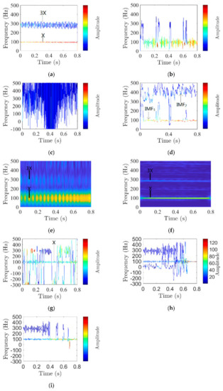 Time–frequency representations of the vibration signal obtained utilizing several methods. (a) Two-Layer SVD of signal after VMD (K = 4); (b) HHT (IMF3); (c) HHT of signal (IMF2); (d) HHT of signal after median filtering (IMF2 and IMF3); (e) The STFT of signal (The length of the window is 256); (f) The STFT of signal (The length of the window is 2560); (g) VNCMD of signal (K = 2); (h) VNCMD of signal (K = 3); (i) VNCMD of signal (K = 4).