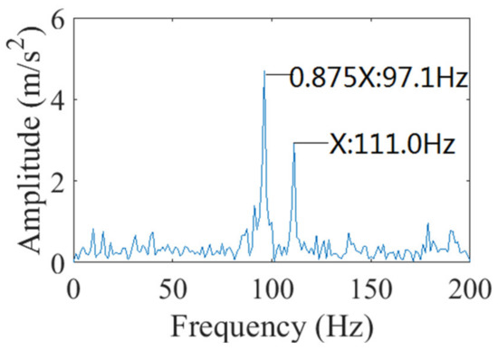 The second layer SVD was performed on the instantaneous frequency. The FFT of the instantaneous frequency is shown in Figure 33. It can be seen that the fluctuating frequencies of the instantaneous frequency are mainly 97.1 Hz, 111.0 Hz, and 208.1 Hz, which are, respectively, equal to 7/8-times, one-time, and 15/8-times the rotation frequency. Moreover, the fluctuating frequencies of the instantaneous frequency of 97.1 Hz and 111.0 Hz are consistent with the fluctuating frequencies on the envelope spectrum. IF fluctuating around the rotation frequency is a feature of rub-impact fault, and it can identify rub-impact fault more clearly than the lower amplitude 2×, 3× in Fourier spectrum in Figure 28b. After comparing with the simulated vibration signal in Figure 13a, it is found that the fluctuating frequencies of IF of 1×, which was obtained by processing the simulated signal in dynamic simulation, do not contain 7/8-times, and 15/8-times the rotation frequency. The fluctuating frequencies of IF of 1×, which was obtained by the processing signal of the real aeroengine test, do not contain two-times the rotation frequency, and three-times the rotation frequency. During the engine test, the rub-impact occurred more complicated than in the dynamic simulation, and the parameters , , etc. in the model were not completely consistent with the parameters in the real aeroengine test.
