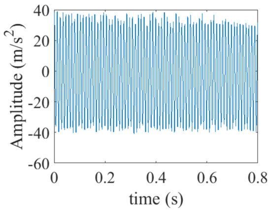 Next, we analyzed the second set of fault data, when the speed of the low-pressure turbine is about 6660 r/min (111.0 Hz). The waveform of the vibration signal is shown in Figure 28a, The FFT of the vibration signal is shown in Figure 28b. After comparing with the simulated vibration signal in Figure 11b, it is found that the Fourier spectra of the dynamic simulation signal and the aeroengine test signal are relatively similar, with higher 1× amplitudes and lower 2× and 3× amplitudes.
