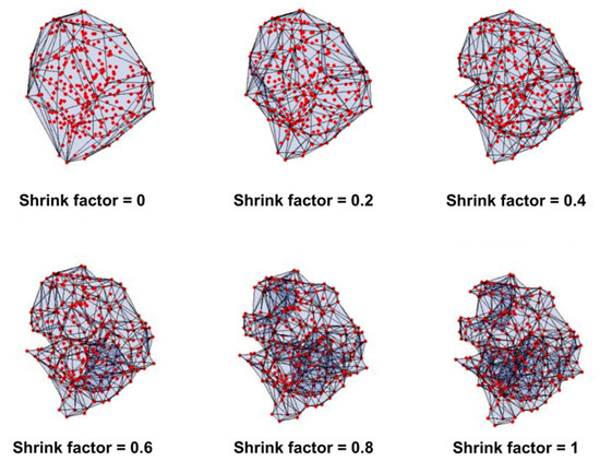 Dependence of the generated external boundary (external protein surface) on the value of the shrink factor. Infrared fluorescent protein (PDB: 5AJG) is reported as an example, with shrink factors equal to 0, 0.2, 0.4, 0.6, 0.8 and 1. Red points represent the nodes of the network (Cα atoms), while the external surface is represented by Delaunay triangles (in light blue), which connect the nodes in the external boundary.