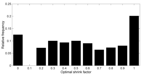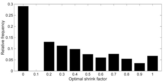 For each of these generated surfaces, the random forces were applied only to the nodes lying on the external boundary. The resulting network displacements were then evaluated from Equations (4)–(7). It follows that the correlation of the average displacements (from 10,000 samples) due to the application of the external forces, i.e., ρFR,EXT, also depends on the adopted shrink factor. The shrink factor that leads to the maximum value of ρFR,EXT for each protein is then selected as the optimal one. Figure 3 reports the statistical distribution of the optimal shrink factors obtained for the 919 single-chain proteins. As can be observed, the optimal shrink factor assumes almost all values, meaning that it is strongly protein-specific. Nevertheless, a slight preference towards shrink factors equal to 1.0 is observed.