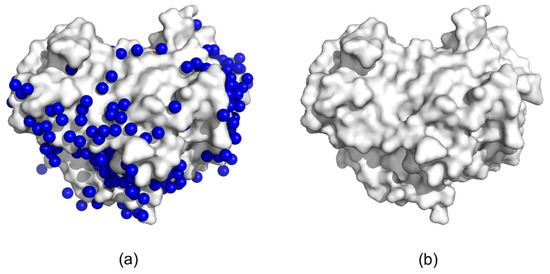 Surface representation of infrared fluorescent protein (PDB: 5AJG): (a) protein structure (light gray) + water molecules (blue spheres); (b) protein structure alone.