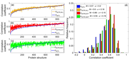 Experimental B-factors vs. mode-based fluctuations and average displacements due to random perturbations (wpfANM—water molecules included): (a–c) correlation coefficients for the 919 protein structures (blue curve for ρW,FL, orange curve for ρW,FR,ALL, red curve for ρW,FR,EXT and green curve for ρW,FR,WAT); (d) statistical distribution of the correlation coefficients. The highest correlations are seen when perturbations are applied on the surface.