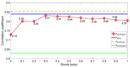 Experimental B-factors vs. mode-based fluctuations and average displacements due to random forces for the infrared fluorescent protein (PDB: 5AJG), with PDB water molecules included. The continuous blue line refers to ρW,FL, the dashed orange line to ρW,FR,ALL, the dotted red line to ρW,FR,EXT, and the dashed-dotted green line to ρW,FR,WAT. The correlations from the application of forces only on the protein’s external surface, i.e., ρW,FR,EXT, depends on the selected shrink factor, in the range 0–1. For each shrink factor, the values reported close to the marker represent the fraction of external nodes out of the total of 533 nodes (301 Cα atoms + 252 water molecules) of the network.