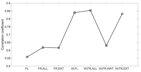 As mentioned in the previous section, the wpfANM is built as the usual pfANM with p equal to 3 (see Equation (2)), except that both the coordinates of the Cα atoms and the water molecules are now considered as a part of the whole structure. Based on the resulting wpfANM, the mode-based fluctuations are evaluated from Equation (3), whereas the average displacements resulting from the random perturbations are computed according to Equations (4)–(7). In the latter cases, as explained above, three types of force application are considered, as shown in Table 1. From the calculations, we then obtain four correlation coefficients to compare with the experimental B-factors, namely ρW,FL, ρW,FR,ALL, ρW,FR,EXT and ρW,FR,WAT, with these being described in Table 1.