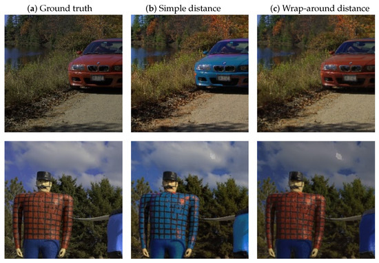 - Cone space distance: Since HSV color space can be represented as a cone model, the most intuitive difference between two HSV colors will be a Euclidean distance in a cone space. In this method, we convert HSV colors of H, S, and V to points in a cone space and calculate a Euclidean distance between the prediction and the target (Figure 11 left).