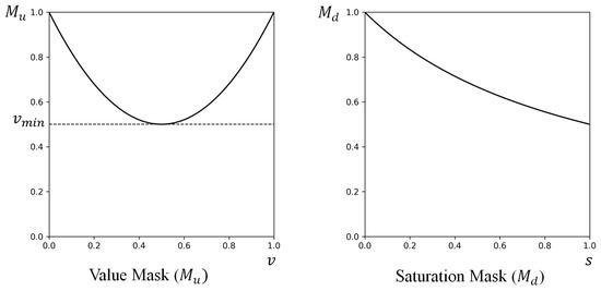 - We present a mask function derived from Saturation (S) and Value (V) information in HSV color space which can detect both over- and underexposed areas and suppress unnecessary information for each channel;