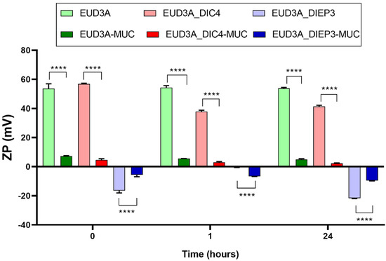 NPs zeta potential values (ZP) before (EUD3A, EUD3A_DIC4, EUD3A_DIEP3) and after (EUD3A_MUC; EUD3A_DIC4-MUC; EUD3A_DIEP3-MUC) 0, 1, and 24 h of incubation with mucin at 37 °C. Significance was set as **** p ≤ 0.0001.
