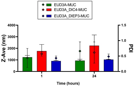 EUD3A, EUD3A_DIC4, and EUD3A_DIEP3 mean size (Z-Ave, bars) and PdI (symbols) after 1 and 24 h of incubation with mucin at 37 °C (EUD3A-MUC, EUD3A_DIC4-MUC, and EUD3A_DIEP3-MUC).