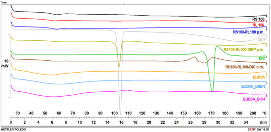 DSC thermograms of RS, RL1, RS/RL physical mixture (p.m.), DIC, DIEP, RS/RL-DIC p.m., RS/RL-DIEP p.m., EUD3A, EUD3A_DIEP3, and EUD3A_DIC4.